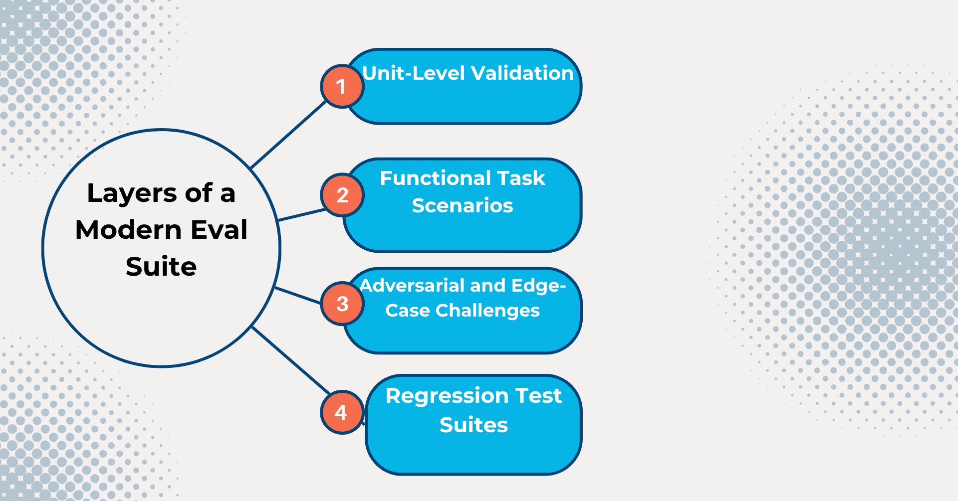 Evaluation is not one-size-fits-all. Robust eval systems use a stratified hierarchy of test types, each probing different aspects of model behavior—from syntax correctness to multi-turn dialogue consistency and failure recovery.