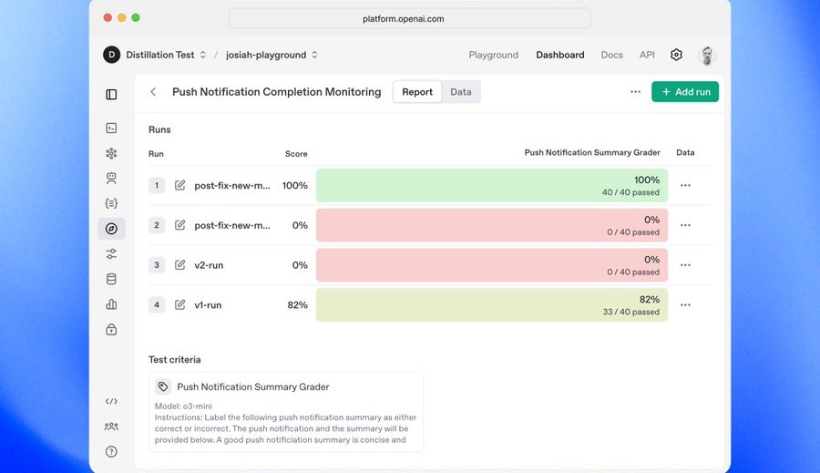 Real-time dashboards surface pass/fail ratios, hallucination rates, bias scores, and task-specific success metrics.